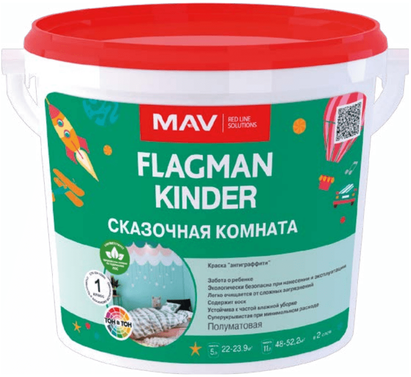 Краска ВД акриловая FLAGMAN KINDER интерьерная белая полуматовая для высококачественной «экологически безопасной» отделки помещений, подвергающихся частому мытью и повышенным физико-механическим нагрузкам (детские спальни, игровые комнаты в жилых домах и детских дошкольных учреждениях, школы, детские кафе, медицинские учреждения и т.п.), по бетонным, оштукатуренным, гипсокартонным гладким и рельефным поверхностям, в том числе по обоям, специально предназначенным под окраску.