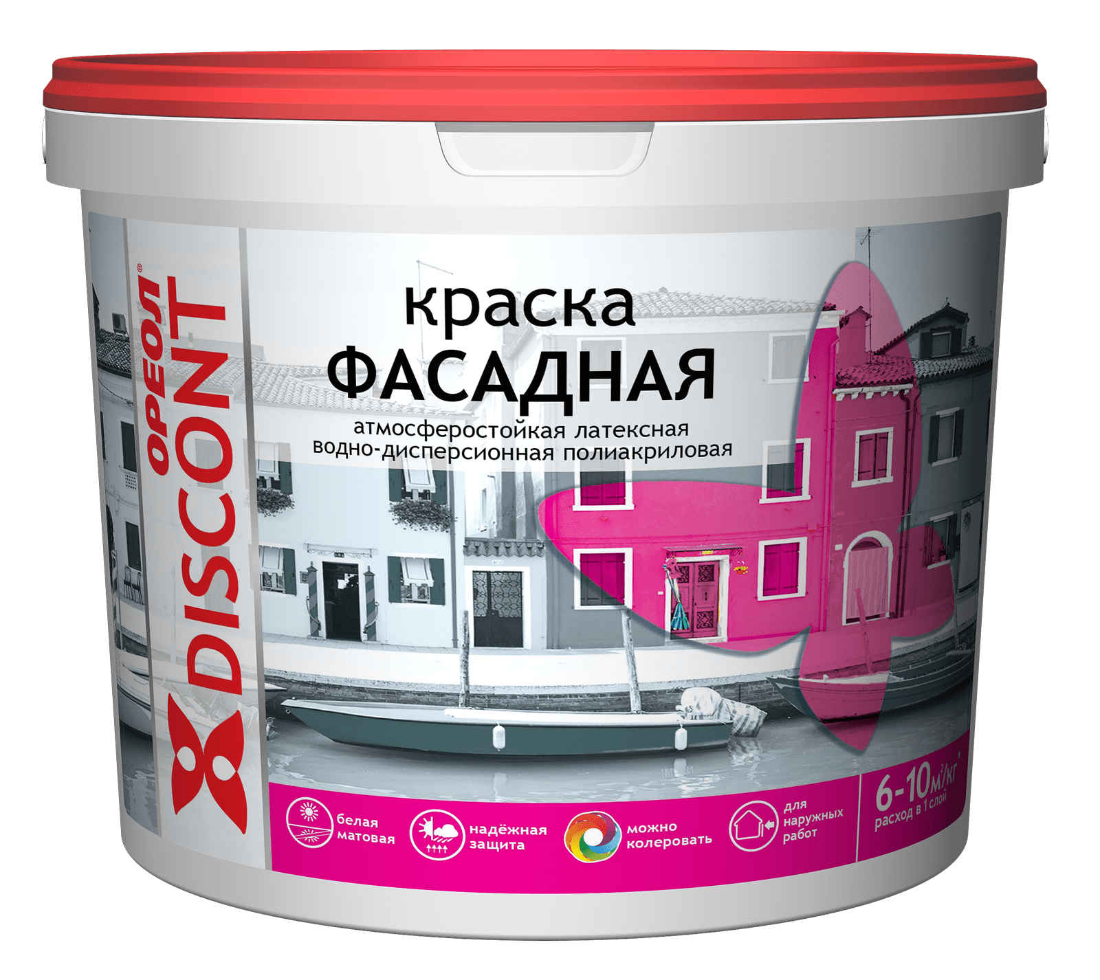Краска акриловая ОРЕОЛ Дисконт фасадная атмосферостойкая белая 1,5 кг предназначена для окрашивания наружных поверхностей жилых и административных зданий. Краску можно наносить на бетонные, кирпичные, оштукатуренные, деревянные и другие пористые поверхности, подвергающиеся атмосферным воздействиям.