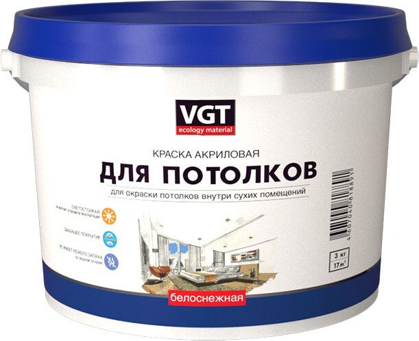 Краска акриловая VGT ВД-АК-2180 для потолков белоснежная 7 кг подходит для окрашивания бетонных, кирпичных, гипсокартонных поверхностей в помещениях с нормальной влажностью. Имеет хорошую адгезию к бетонным, кирпичным, гипсокартонным и оштукатуренным поверхностям. При необходимости краску можно смыть при помощи жёсткой щётки и моющего средства. Может использоваться как “эконом” вариант краски для стен. После высыхания образует ровную матовую поверхность. Светостойкая (не желтеет в процессе эксплуатации). Образует «дышащее» покрытие, не мелит.
