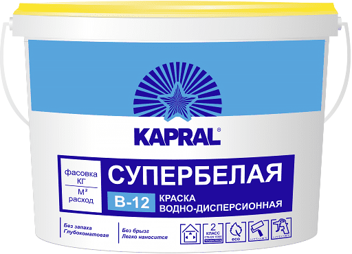 Краска ВД KAPRAL B-12 7,5 кг для окраски стен и потолков внутри сухих помещений.