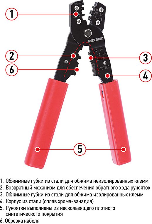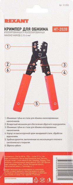 Кримпер для обжима автоклемм REXANT HT-202B (12-3032) предназначен для обжима неизолированных и изолированных клемм размером 0,10 – 6,0 мм2. Материал изделия (корпуса): высокопрочная закаленная инструментальная сталь. Покрытие изделия (корпуса): воронение. Возвратный механизм для обеспечения обратного хода рукояток.