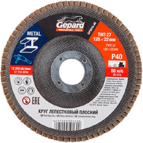 Круг лепестковый 125х22,2 мм P120 плоский GEPARD (GP5016-120) рекомендован для работы с плоскими деталями, внешними швами на прямолинейных поверхностях. Предназначен для шлифовальных работ по металлу, инструментальной стали, чугуну, дереву и пластику. Материал: корунд (оксид алюминия), тканевая основа, обод из инструментальной стали. Применяется с УШМ соответствующего типоразмера. Форма круга: плоская прямая (T27).