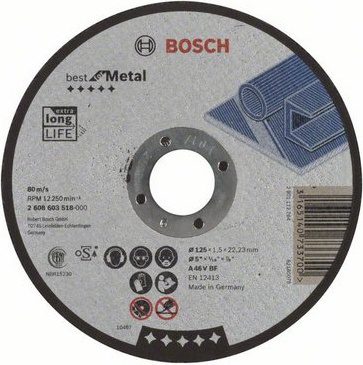 Круг отрезной 125х1.5×22.2 мм BOSCH Best for Metal (2608603518) — профессиональная оснастка для ручных углошлифмашин. Отрезной круг по металлу топ-класса, отвечает самым жестким требованиям. Максимальная окружная скорость: 80 м/с (в зависимости от частоты вращения и диаметра круга).