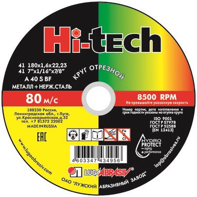 Круг отрезной 180х1.6×22,2 мм LUGAABRASIV Hi-tech (4603347434956) изготовлены по уникальной, единственной в мире технологии, которая позволяет получить самый тонкий круг. Использование передовых технологий, современного оборудования и специализированных высококачественных материалов позволяет достигнуть «тонкой» высоты круга, равномерную твердость, самый низкий дисбаланс, что безусловно гарантирует точный и качественный рез. Круги «Hi-tech» имеют множество преимуществ. При изготовлении кругов используется специальное покрытие материалов, которое позволяет не только увеличить длительность срока службы, но также обеспечить их влагостойкость, что особенно важно при перевозке морским транспортом. Самые тонкие круги, согласно мировым стандартам, позволяют выполнять резы быстро, чисто и очень точно без усилий. Круги работают с низким уровнем шума и запыленности, при этом не образуются заусенцы и нет изменения цвета металла. Минимальное количество заусенцев и чистые кромки реза позволяют сократить время, затрачиваемое на обработку, что существенно облегчает работу при резке.
