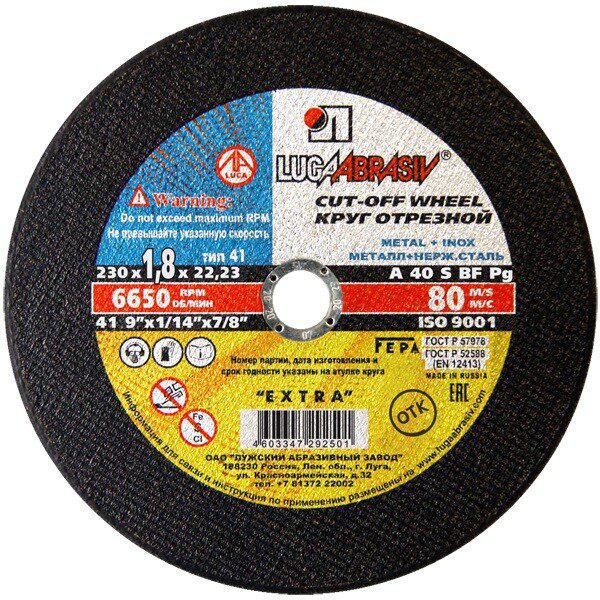 Круг отрезной 230х1,8х22 мм LUGAABRASIV для металла для высокопроизводительной резки деталей и конструкций из различных марок стали и быстрорежущей стали. Особенно эффективны при резке тонкостенного профиля и листового металла.