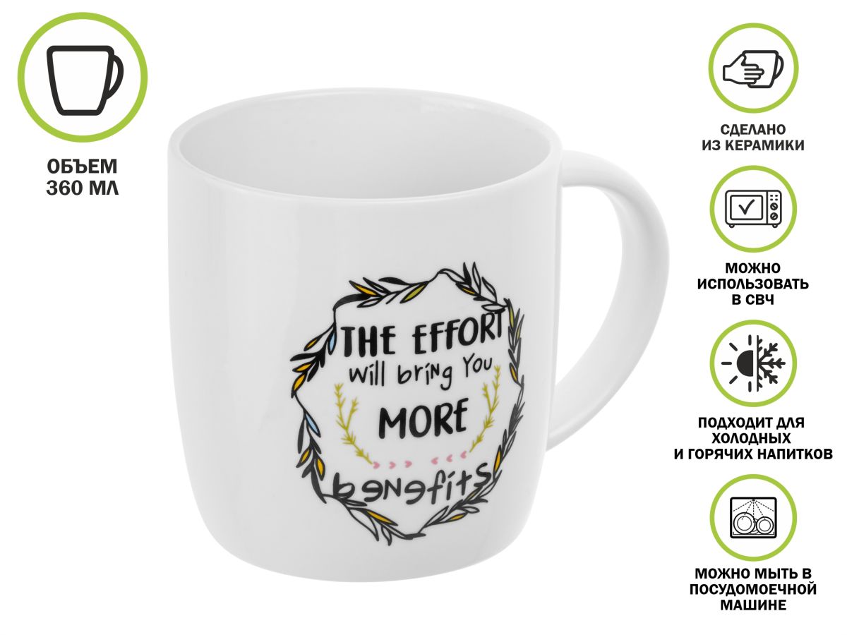 Кружка керамическая PERFECTO LINEA Joyful day-2 360 мл (30-250302) – подходит для подачи горячих и холодных напитков. Керамика отличается высокой экологичностью. Допускается применение при любой температуре: холодильник, разогрев в микроволновой печи. Неустойчива к перепадам температуры. Можно мыть в посудомоечной машине.
