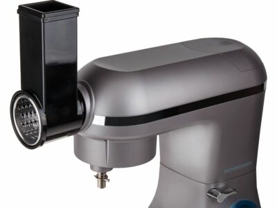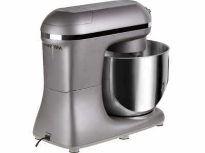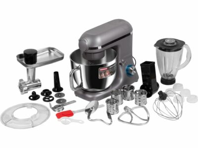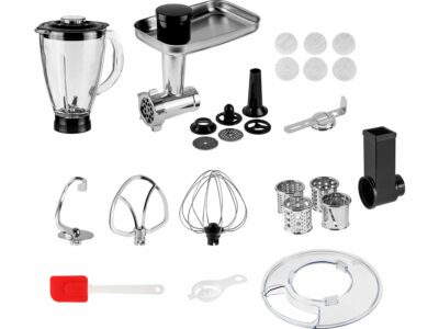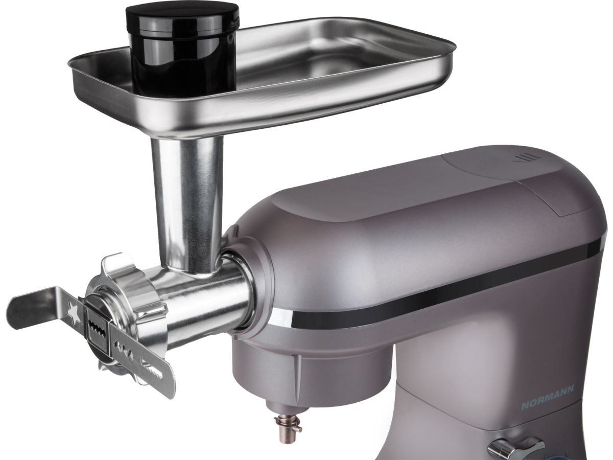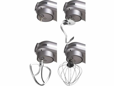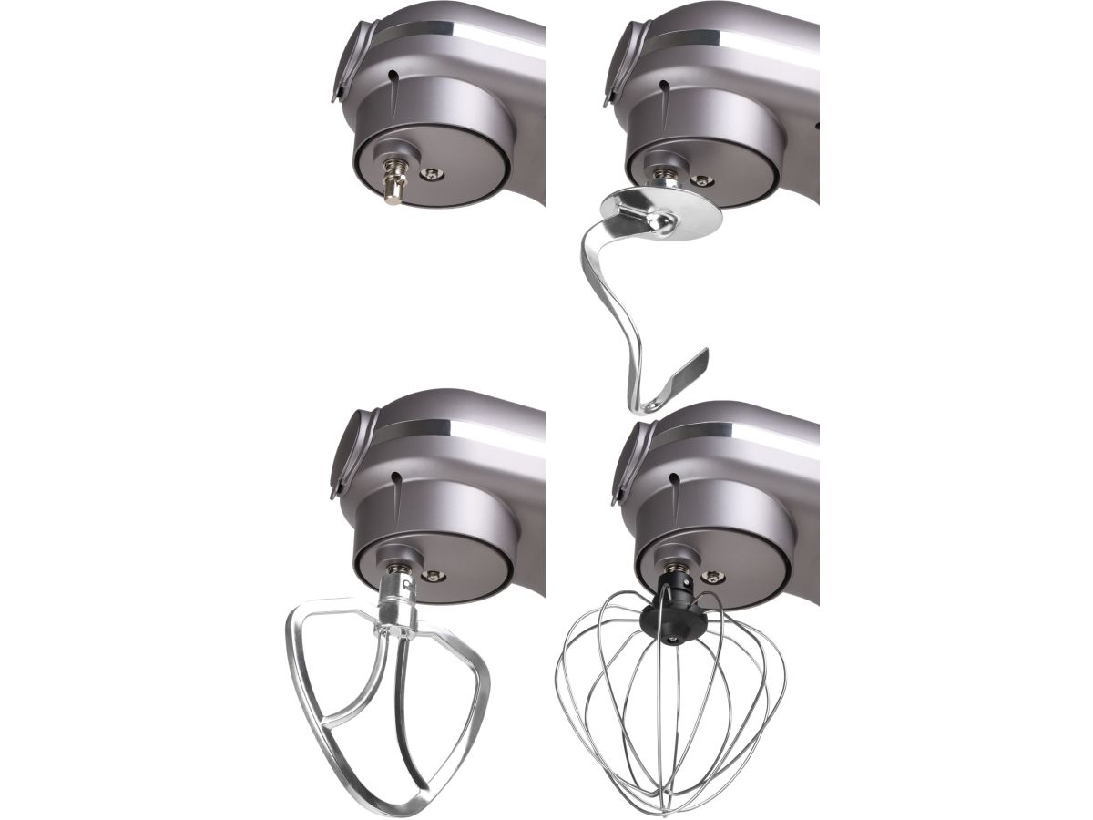 Миксер укомплектован тремя насадками: венчиком для взбивания, насадкой для перемешивания и крюком для теста. Перемешивание происходит в большой чаше (7 л) с ручкой, выполненной из нержавеющей стали и укомплектованной пластиковой защитной крышкой.