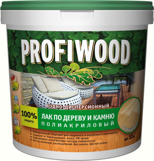 Лак акриловый PROFIWOOD для дерева и камня 0,9 кг предназначен для декоративной отделки и защиты деревянных (кроме полов) поверхностей, искусственного и натурального камня, кирпича, бетонных и других минеральных поверхностей, эксплуатируемых в атмосферных условиях и внутри помещений.