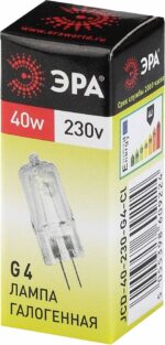 Лампа галогенная G4 ЭРА JCD 40 Вт – галогенная лампа с высокой светоотдачей и устойчивостью к перепадам напряжения. Дает яркий приятный для глаз свет. Отличается хорошей цветопередачей – такое искусственное освещение не искажает естественные оттенки предметов в помещении.
