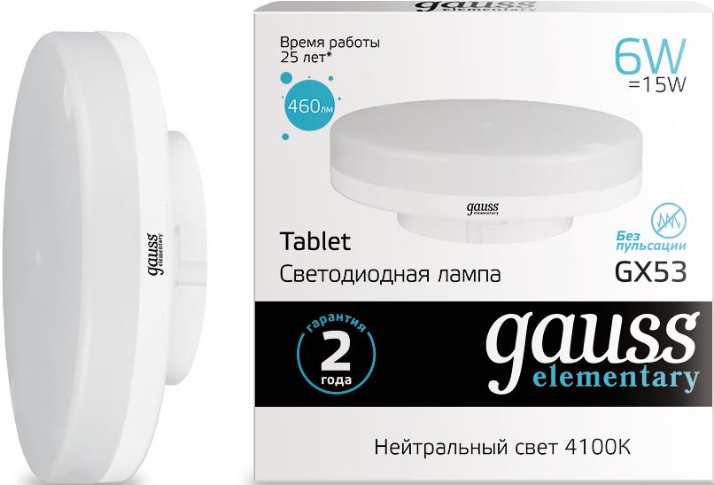 Лампа светодиодная GX53 GAUSS Elementary 6 Вт 4100K (83826) дает мягкий немерцающий свет, обладает всеми техническими характеристиками европейского уровня.Световой поток лампы 460 Лм. Ее время работы составляет 25 000 ч. Угол светового пучка равен 120°. Степень защиты лампы IP20, климатическое исполнение У3, коэффициент пульсации <5%.В лампе используются защищенные конденсаторы CBB, которые обеспечивают стабильную работу с любыми выключателями без миганий и вспыхивания.Светодиоды большей мощности при меньшем количестве обеспечивают максимальную эффективность с минимальным нагревом.