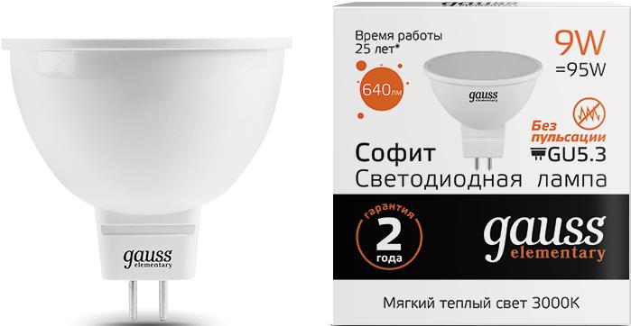Лампа светодиодная GU5.3 GAUSS Elementary MR16 9 Вт 3000K (13519) дает мягкий немерцающий свет, обладает всеми техническими характеристиками европейского уровня.Световой поток лампы 640 Лм. Ее время работы составляет 25 000 ч. Угол светового пучка равен 120°. Степень защиты лампы IP20, климатическое исполнение У3, коэффициент пульсации <5%.В лампе используются защищенные конденсаторы CBB, которые обеспечивают стабильную работу с любыми выключателями без миганий и вспыхивания.Светодиоды большей мощности при меньшем количестве обеспечивают максимальную эффективность с минимальным нагревом.