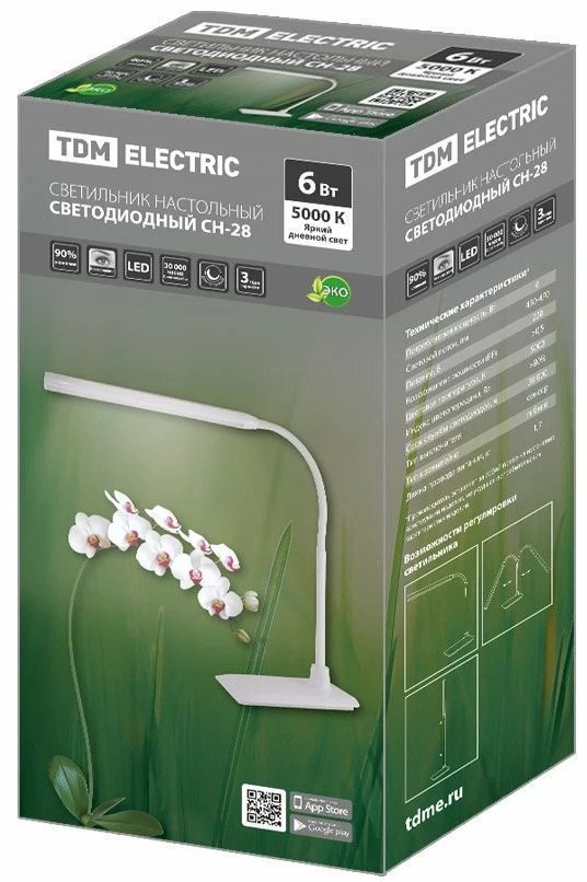 Лампа настольная светодиодная 6 Вт 5000 К TDM СН-28 белый (SQ0337-0094) – это идеальное энерго-эффективное решение для освещения рабочего места. Светильники настольные LED TDM ELECTRIC прекрасно впишутся как в уютную домашнюю обстановку, так и в строгий офисный интерьер. Светодиодные настольные светильники TDM Electric не требуют замены источника света. Срок службы настольных светодиодных светильников TDM ELECTRIC – 50 000 часов. Светодиоды закрыты матовым рассеивателем, что позволяет создать мягкий рассеянный свет без слепящего эффекта. При работе светильник не нагревается, что делает его использование абсолютно безопасным.