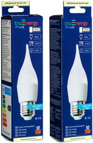 Лампа светодиодная E27 TRUENERGY CA37 5 Вт 4000K (14140) обладая низким энергопотреблением, этот лампа светодиодная является заменой лампочки накаливания мощностью до 40 Ватт.Модель обладает нейтральным цветом свечения, который прекрасно подходит и как для жилых помещений и комнат, так и для рабочих зон (офисов, кабинетов, производств) . Данный свет стимулирует к работе не вызывая перенапряжения глаз и не искажая цветопередачу. Универсальное и наиболее распространенное решение.