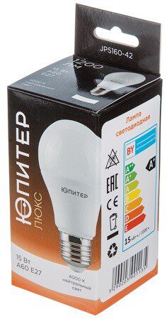 Лампа светодиодная E27 ЮПИТЕР Люкс A60 15 Вт 4000К (JP5160-42) предназначена для использования в стандартных электрических сетях. Не создает электромагнитных помех другим устройствам, соответствует всем стандартам по энергобезопасности. Алюминиевый радиатор в пластиковом кожухе обеспечивает низкую температуру нагрева за счёт отвода тепла от основных частей лампы. Класс А+ энергоэффективности гарантирует максимальную световую отдачу при минимальных затратах на энергопотребление. Время работы – 30000 часов. Температура использования от -25 до +40 градусов Цельсия.