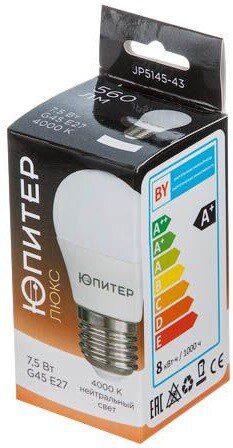 Лампа светодиодная E27 ЮПИТЕР Люкс G45 7,5 Вт 4000К (JP5145-43) предназначена для использования в стандартных электрических сетях. Не создает электромагнитных помех другим устройствам, соответствует всем стандартам по энергобезопасности. Алюминиевый радиатор в пластиковом кожухе обеспечивает низкую температуру нагрева за счёт отвода тепла от основных частей лампы. Класс А+ энергоэффективности гарантирует максимальную световую отдачу при минимальных затратах на энергопотребление. Время работы – 30000 часов. Температура использования от -25 до +40 градусов Цельсия.