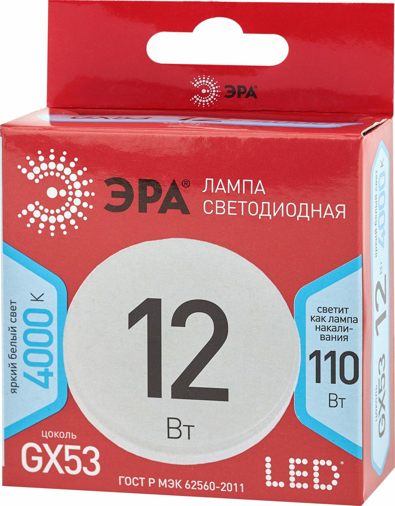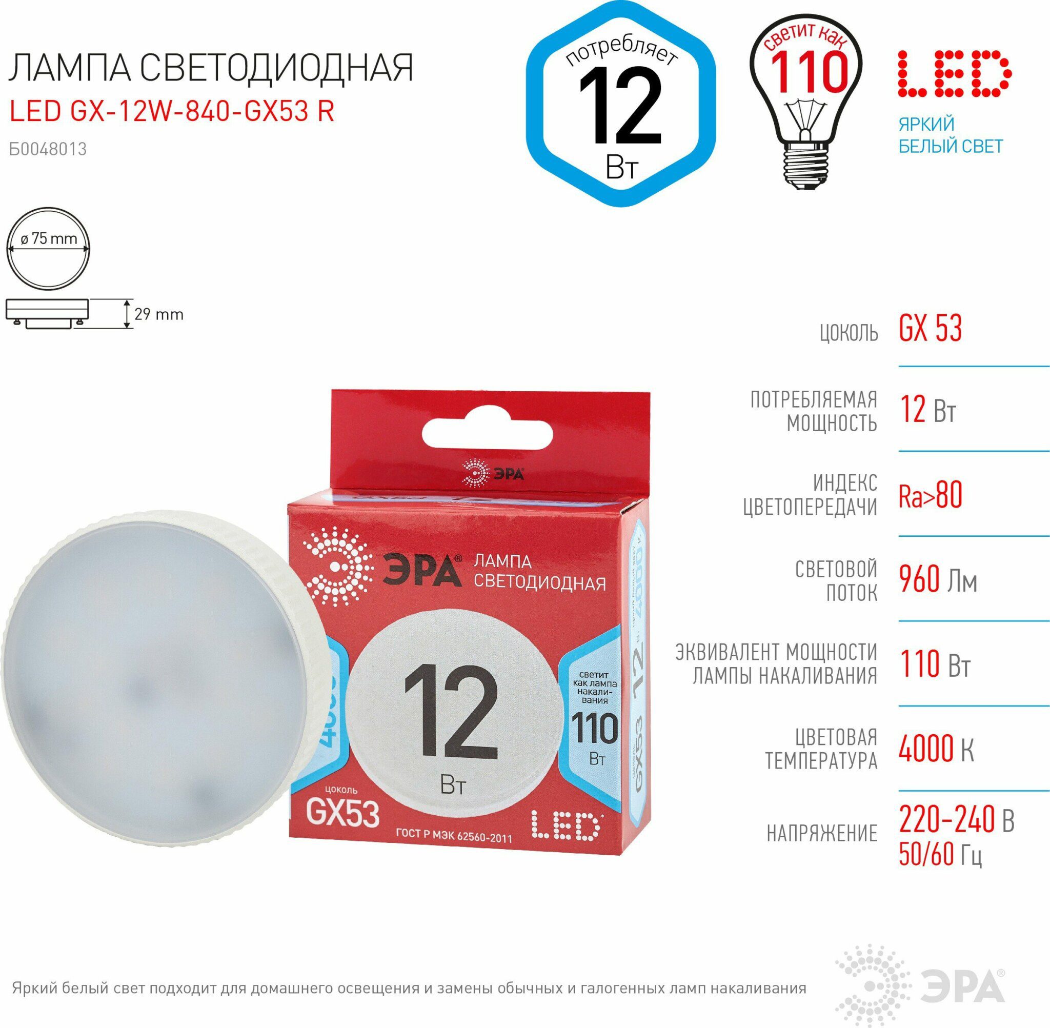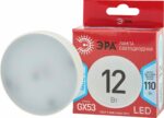 Лампа светодиодная GX53 ЭРА Red Line Led Таблетка 12 Вт 4000К (GX-12W-840-GX53 R) с отличными характеристиками для установки в люстры и все типы бытовых светильников – потолочные, настольные, бра. Бережёт электроэнергию, ярко светит, имеет долгий срок службы. Цветовая температура – белый свет. Такое освещение бодрит, повышает работоспособность. Этот современный источник света создаёт комфортное и безопасное для глаз освещение.