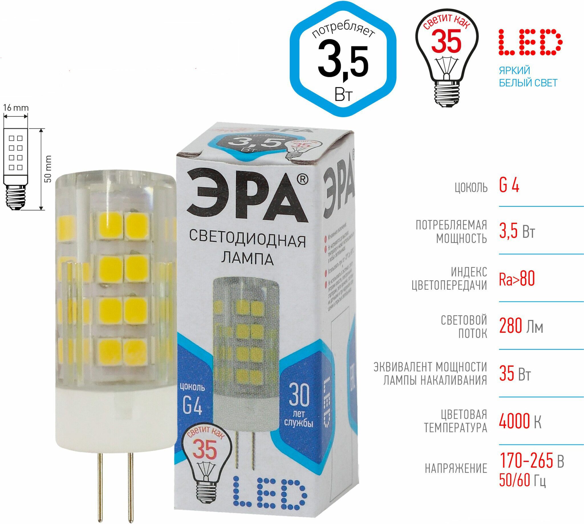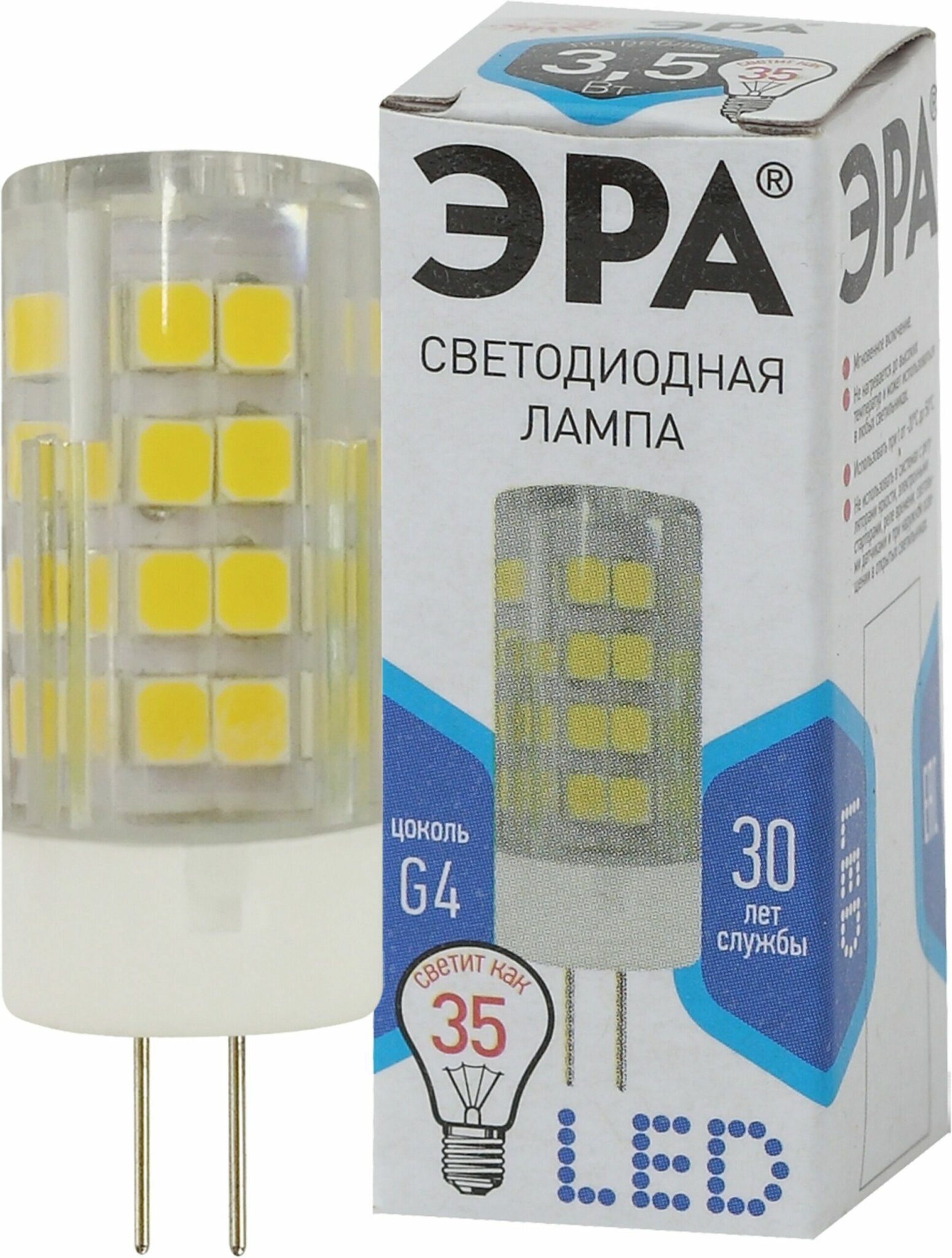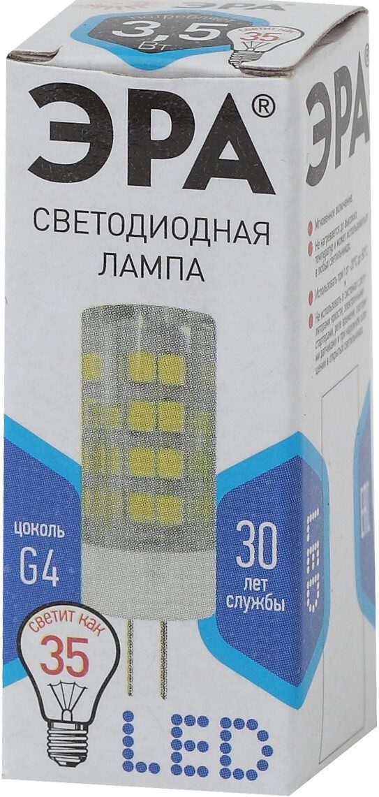 Лампа светодиодная G4 ЭРА ceramic-840 STD JC 3,5 Вт создает яркое ровное освещение и экономит до 90% электроэнергии по сравнению с лампой накаливания с аналогичным световым потоком. Светит теплым светом с желтым оттенком – такая цветовая температура эффективна для отдыха и уютной атмосферы в доме. Используется в потолочных, настенных, настольных светильниках, в люстрах и бра. Мгновенно включается и не нагревается.