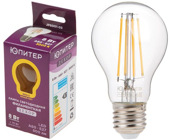 Лампа светодиодная филаментная E27 ЮПИТЕР А60 8 Вт 3000К (JP6001-03) стандартной формы предназначена для использования с любыми светильниками соответствующей мощности и цоколем. Теплый белый свет для создания комфортных условий.