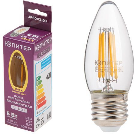 Лампа светодиодная филаментная E27 ЮПИТЕР C37 6 Вт 3000К (JP6003-03) в форме свечи предназначена для использования с любыми светильниками соответствующей мощности и цоколем. Теплый белый свет для создания комфортных условий.