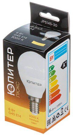 Лампа светодиодная E14 ЮПИТЕР Люкс G45 6 Вт 3000К (JP5145-30) предназначена для использования в стандартных электрических сетях. Не создает электромагнитных помех другим устройствам, соответствует всем стандартам по энергобезопасности. Алюминиевый радиатор в пластиковом кожухе обеспечивает низкую температуру нагрева за счёт отвода тепла от основных частей лампы. Класс А+ энергоэффективности гарантирует максимальную световую отдачу при минимальных затратах на энергопотребление. Время работы – 30000 часов. Температура использования от -25 до +40 градусов Цельсия.
