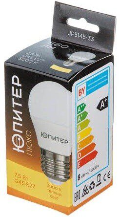 Лампа светодиодная E27 ЮПИТЕР Люкс G45 7,5 Вт 3000К (JP5145-33) предназначена для использования в стандартных электрических сетях. Не создает электромагнитных помех другим устройствам, соответствует всем стандартам по энергобезопасности. Алюминиевый радиатор в пластиковом кожухе обеспечивает низкую температуру нагрева за счёт отвода тепла от основных частей лампы. Класс А+ энергоэффективности гарантирует максимальную световую отдачу при минимальных затратах на энергопотребление. Время работы – 30000 часов. Температура использования от -25 до +40 градусов Цельсия.