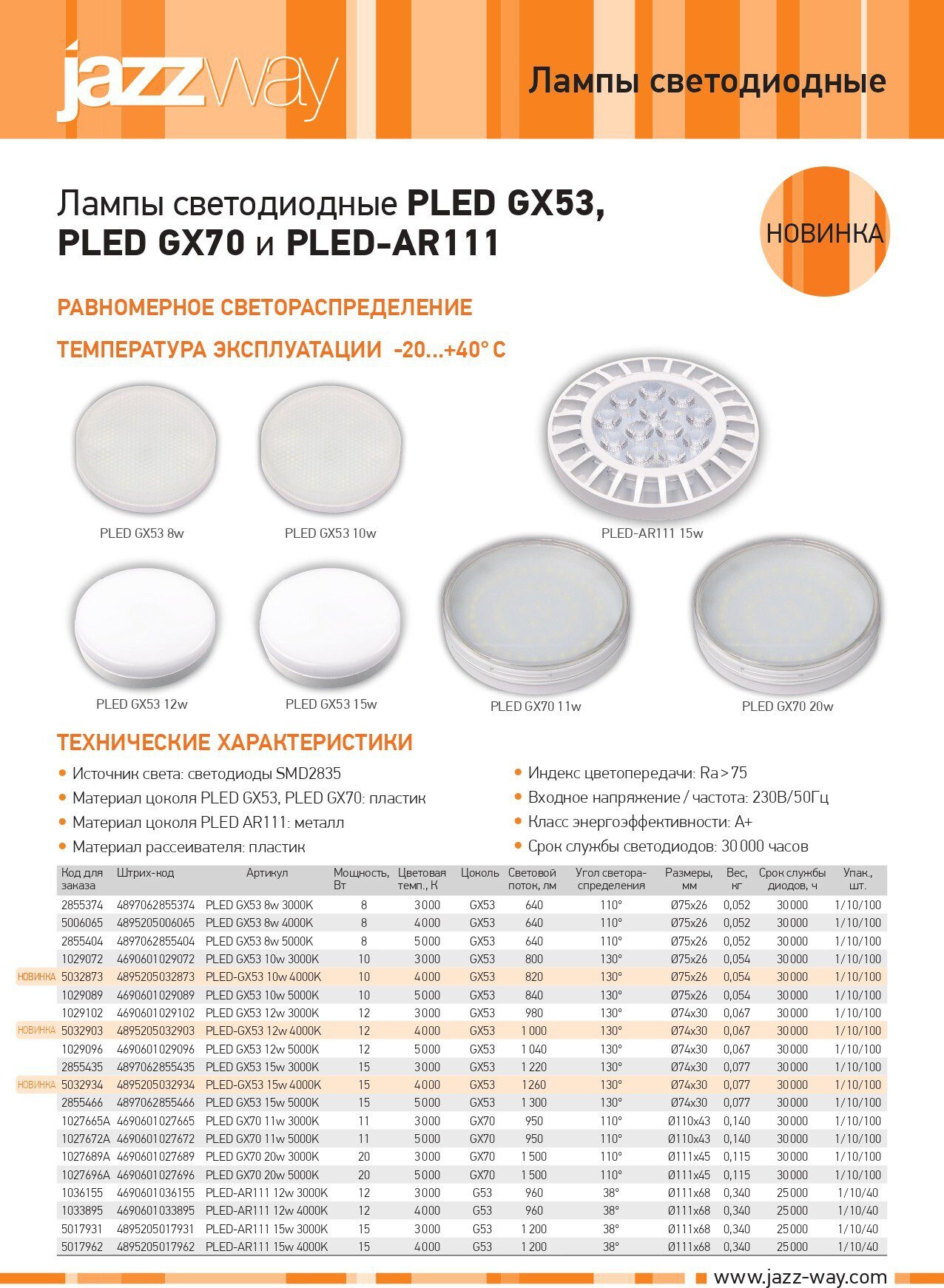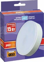 Лампа светодиодная GX53 JAZZWAY Pled power таблетка 15 Вт 5000К (2855466) – это максимальная мощность и максимальный световой поток по доступной цене. Конструктивные особенности лампы PLED POWER (внутренний корпус – алюминиевый, внешний – пластиковый) обеспечивают эффективный теплоотвод для этой серии мощных ламп с компактными размерами. Предназначена для освещения жилых, офисных и коммерческих помещений. Экономия электроэнергии более 80%. Высокая надёжность. Прочная конструкция. Отсутствие УФ- и ИК-излучения. Лампы экологически безопасны – не содержат тяжелых металлов и ртути. Лампы не диммируются.
