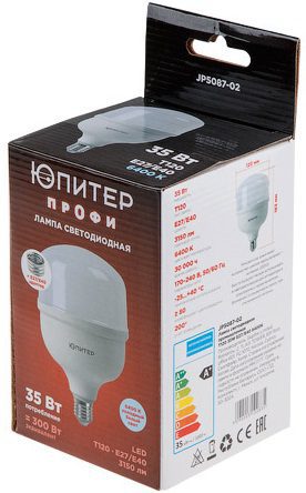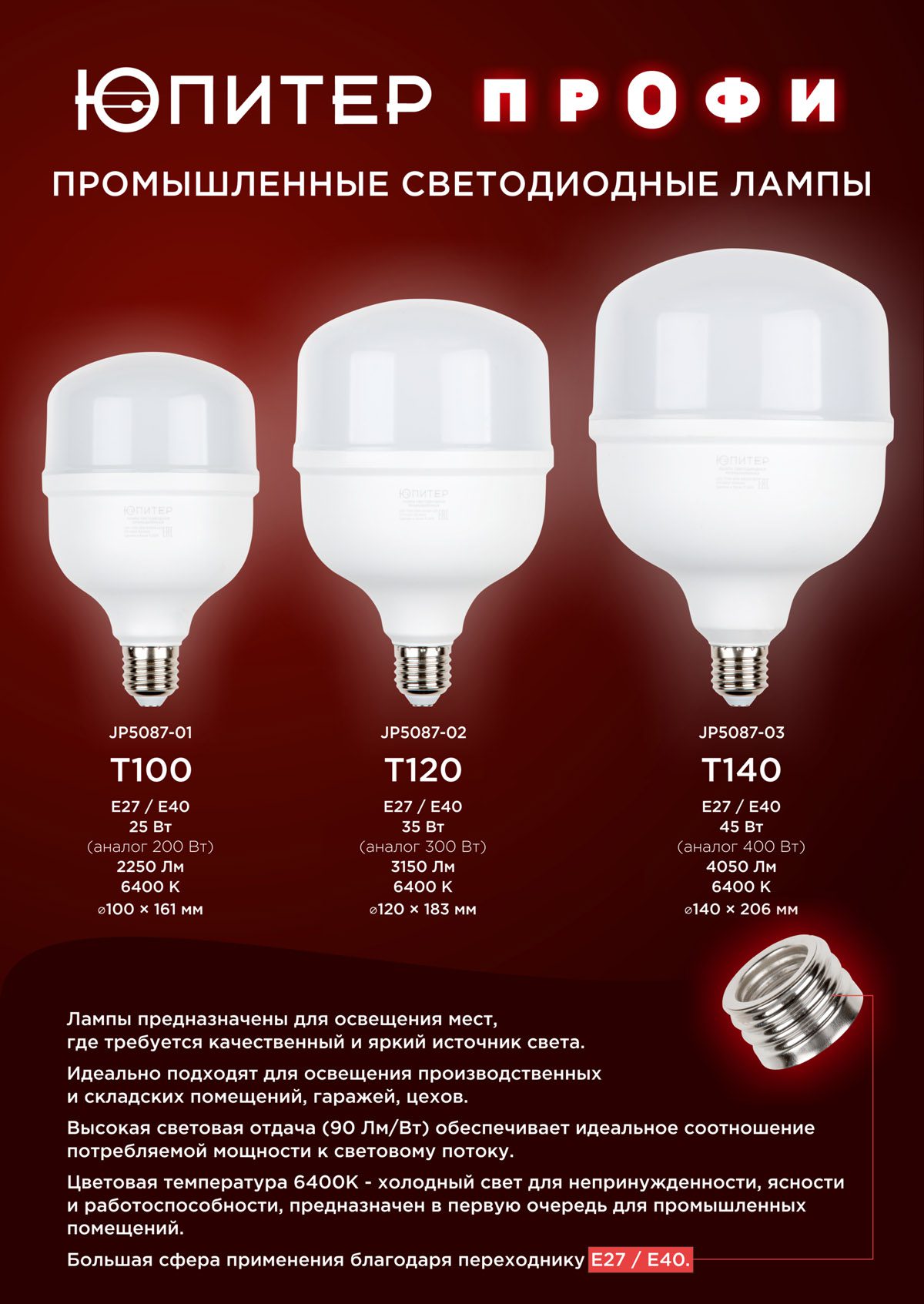 Лампа светодиодная промышленная E27/E40 35 Вт 6400К ЮПИТЕР T120 (JP5087-02) предназначена для использования в промышленных помещениях. Благодаря наличию переходника в комплекте может использоваться со стандартными цоколями Е27 и Е40. Срок службы лампы – до 30000 часов.