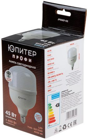 Лампа светодиодная промышленная E27/E40 45 Вт 6400К ЮПИТЕР T140 (JP5087-03) предназначена для использования в промышленных помещениях. Благодаря наличию переходника в комплекте может использоваться со стандартными цоколями Е27 и Е40. Срок службы лампы – до 30000 часов.