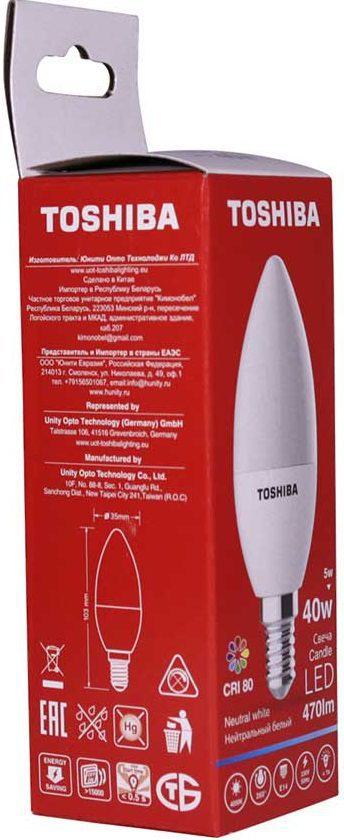 Лампа светодиодная E14 TOSHIBA Candle 5 Вт 4000K имеет форму свечи, излучает естественный белый свет, является аналогом лампы накаливания мощностью 40 Вт. Предназначена для освещения небольших помещений при совместной работе со светильником, имеющим соответствующий цоколь и мощность.