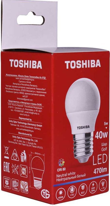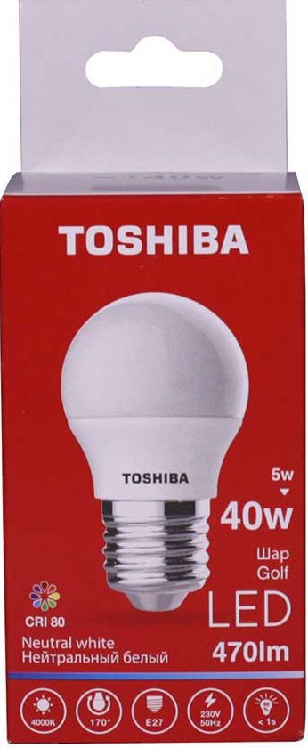 Лампа светодиодная E27 TOSHIBA Golf 5 Вт 4000K имеет форму шара, излучает естественный белый свет, является аналогом лампы накаливания мощностью 60 Вт. Предназначена для освещения помещений при совместной работе со светильником, имеющим соответствующий цоколь и мощность.