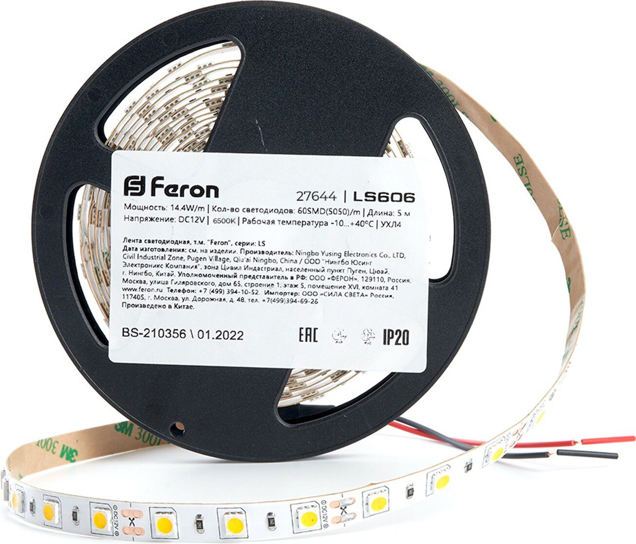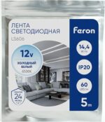 Лента светодиодная 5050 14,4 Вт/м FERON LS606 5 м холодный белый (27644) предназначена для декоративной подсветки внутри помещений, создания статических и светодинамических эффектов. Подключение светодиодной ленты осуществляется через блок питания постоянного тока на напряжение 12В DC (не входит в комплект поставки).