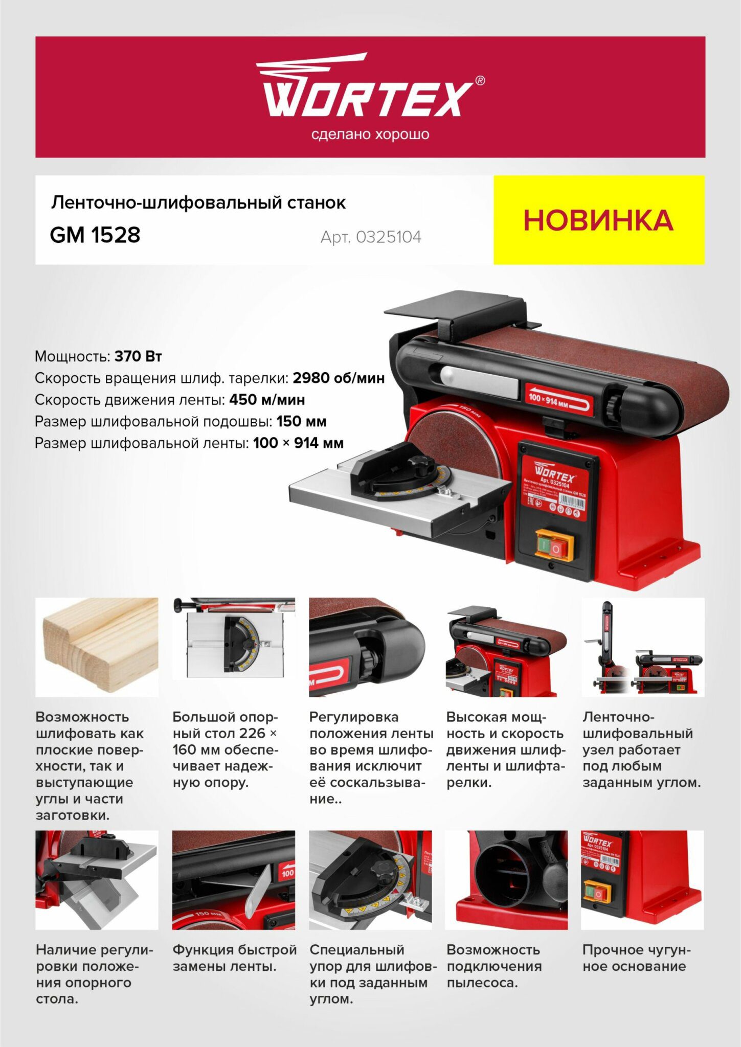 Станок шлифовальный деревообрабатывающий WORTEX GM 1528 (0325104) идеально подходит для обработки изделий из древесины, обладая мощным 370 Вт двигателем. С помощью ленточного узла, станок позволяет быстро шлифовать поверхность плоских заготовок, а наличие шлифовального диска даёт возможность выравнивать углы и выступающие части. Большой опорный стол 226х160 мм обеспечивает устойчивость на поверхности во время проведения работ, а наличие специального упора позволяет шлифовать торцы и кромки под заданным углом. Настраиваемый ленточно-шлифовальный узел может работать под любым углом, как горизонтально, так и вертикально. А удобный механизм натяжения обеспечивает пользователю быструю замену ленты. Скорость движения ленты: 450 м/мин. Размер шлифовальной подошвы: 150 мм. Размер шлифовальной ленты: 100х914 мм. Степень защиты: IP20.