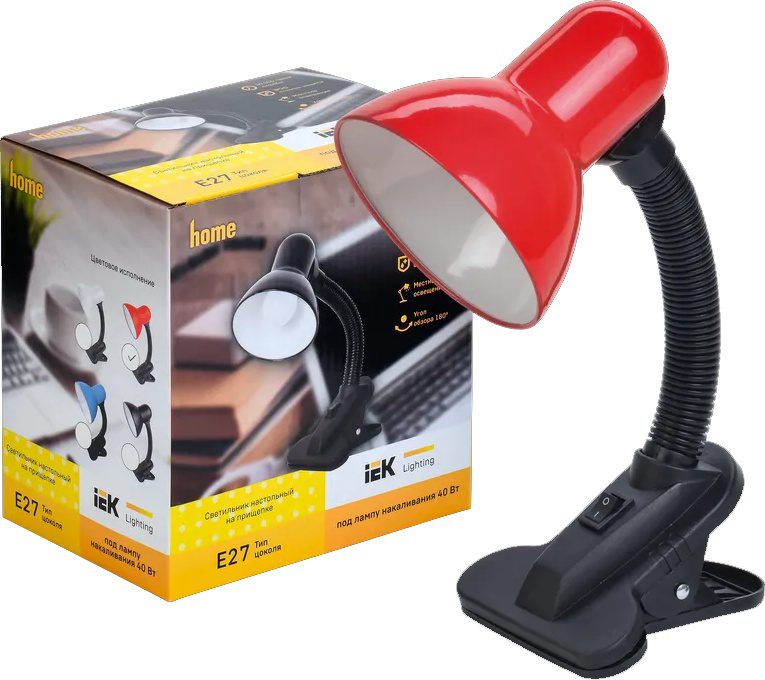 Лампа настольная IEK Lighting 1001 красный ‒ классический настольный светильник со сменной лампой. Прост и удобен в применении, предназначен для создания дополнительного освещения рабочего места. Простая конструкция, позволяющая легко регулировать угол наклона. Светильники с креплением прищепка устанавливаются на краю стола, навесной полке и т.д. Они очень мобильны, и вы можете организовать рабочее освещение в любом месте. Подходит для ламп мощностью 40 Вт.