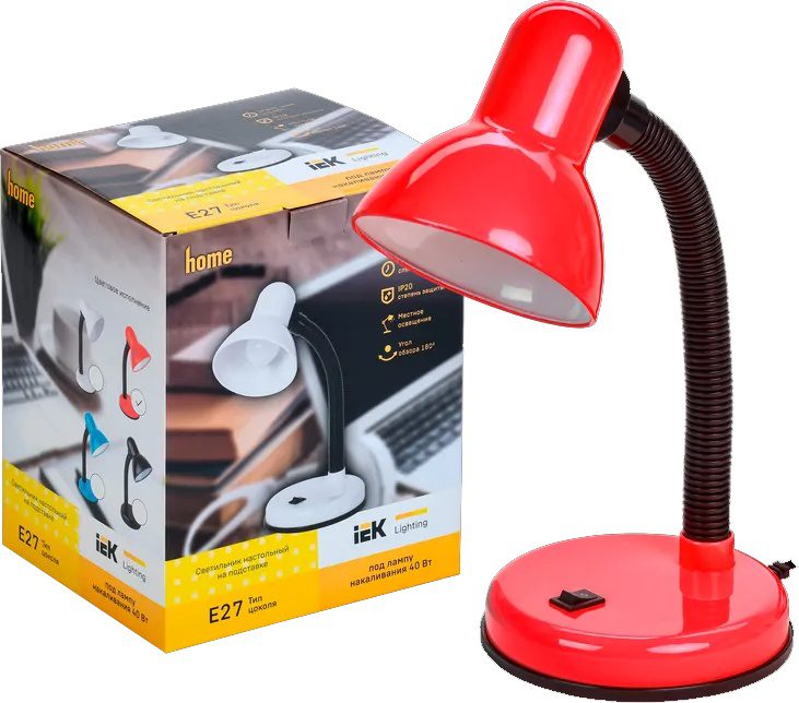 Лампа настольная IEK Lighting 1002 красный ‒ классический настольный светильник со сменной лампой. Прост и удобен в применении, предназначен для создания дополнительного освещения рабочего места. Простая конструкция, позволяющая легко регулировать угол наклона. Основание-подставка – классический вариант, когда осветительный прибор ставится прямо на стол. Светильник легко передвинуть и отрегулировать степень освещения. Подходит для ламп мощностью 40 Вт.