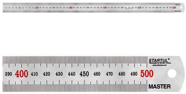 Линейка измерительная 500 мм STARTUL Master (ST3500-050) изготовлена из нержавеющей стали. Используется при проведении измерительных и разметочных работ. Нанесена двойная шкала деления в см/мм. Шкала двухсторонняя. Метод нанесения шкалы: травление. Цена деления: 1 мм. Линейка упакована в пластиковый чехол.