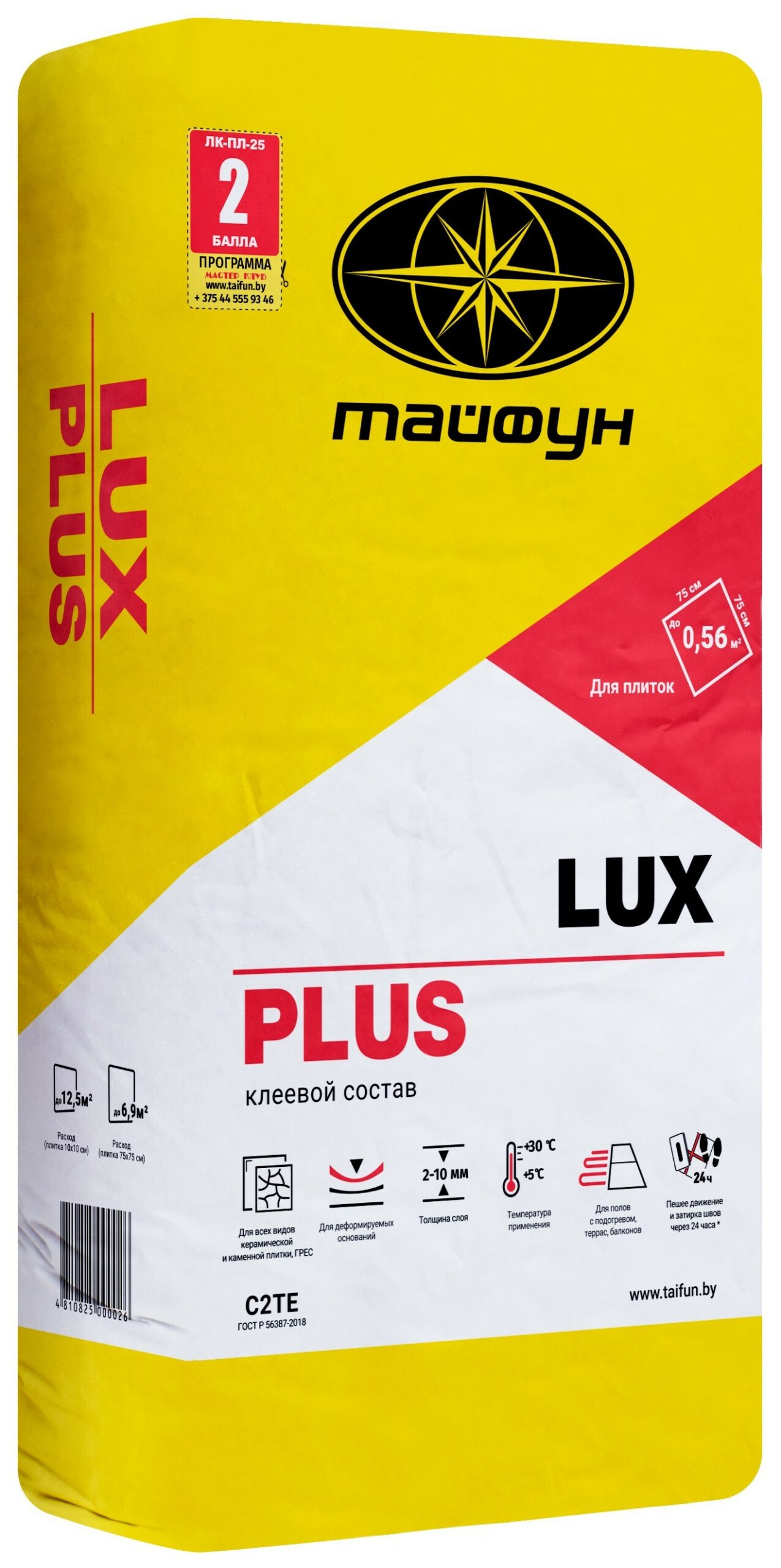 Клей для плитки ТАЙФУН Люкс плюс 25 кг – цементный клей с увеличенной адгезией, для облицовки оснований плиткой различного размера, мозаикой, натуральным и искусственным камнем. Отлично ведет себя при эксплуатации в условиях повышенной влажности или при постоянном контакте с водой. Используется для наружных и внутренних работ. Производится в виде сухой смеси, состоящей из цементного вяжущего, заполнителя и специально подобранных модифицирующих добавок высокого качества. Клеевой состав имеет широкий диапазон применения, благодаря использованию добавок, обеспечивающих высокое начальное сцепление клея с основанием и плиткой различного размера, мозаикой, натуральным и искусственным камнем. Обладает повышенной фиксацией и отсутствием сползания, которые позволяют производить приклеивание плитки «сверху вниз». Оптимальный подбор консистенции и толщины слоя исключают сползание клея, что позволяет начинать работу от верхней части стены и избегать приклеивания отрезанных плиток в хорошо просматриваемых местах.