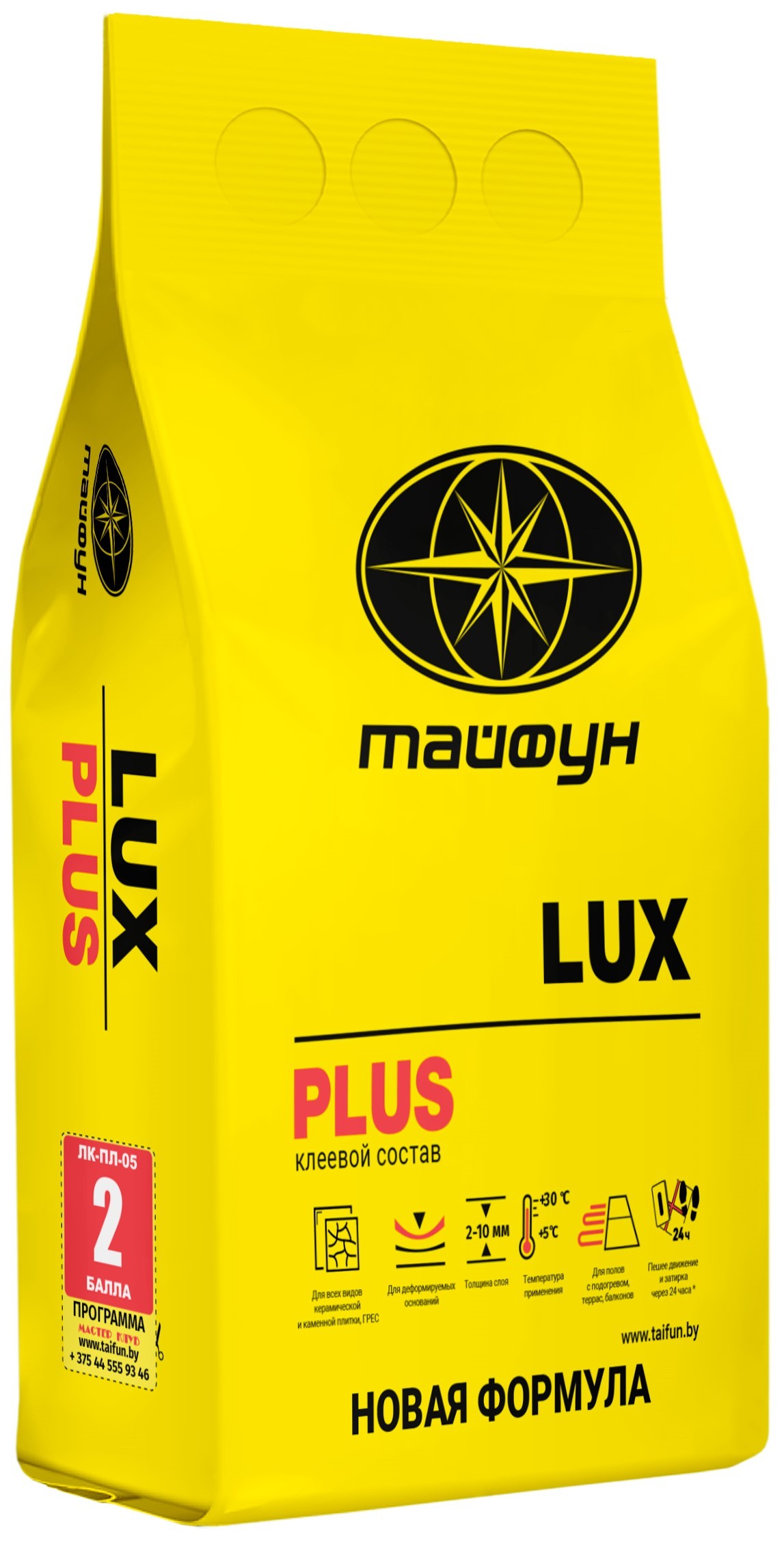 Клей для плитки ТАЙФУН Люкс плюс 5 кг – цементный клей с увеличенной адгезией, для облицовки оснований плиткой различного размера, мозаикой, натуральным и искусственным камнем. Отлично ведет себя при эксплуатации в условиях повышенной влажности или при постоянном контакте с водой. Используется для наружных и внутренних работ. Производится в виде сухой смеси, состоящей из цементного вяжущего, заполнителя и специально подобранных модифицирующих добавок высокого качества. Клеевой состав имеет широкий диапазон применения, благодаря использованию добавок, обеспечивающих высокое начальное сцепление клея с основанием и плиткой различного размера, мозаикой, натуральным и искусственным камнем. Обладает повышенной фиксацией и отсутствием сползания, которые позволяют производить приклеивание плитки «сверху вниз». Оптимальный подбор консистенции и толщины слоя исключают сползание клея, что позволяет начинать работу от верхней части стены и избегать приклеивания отрезанных плиток в хорошо просматриваемых местах.