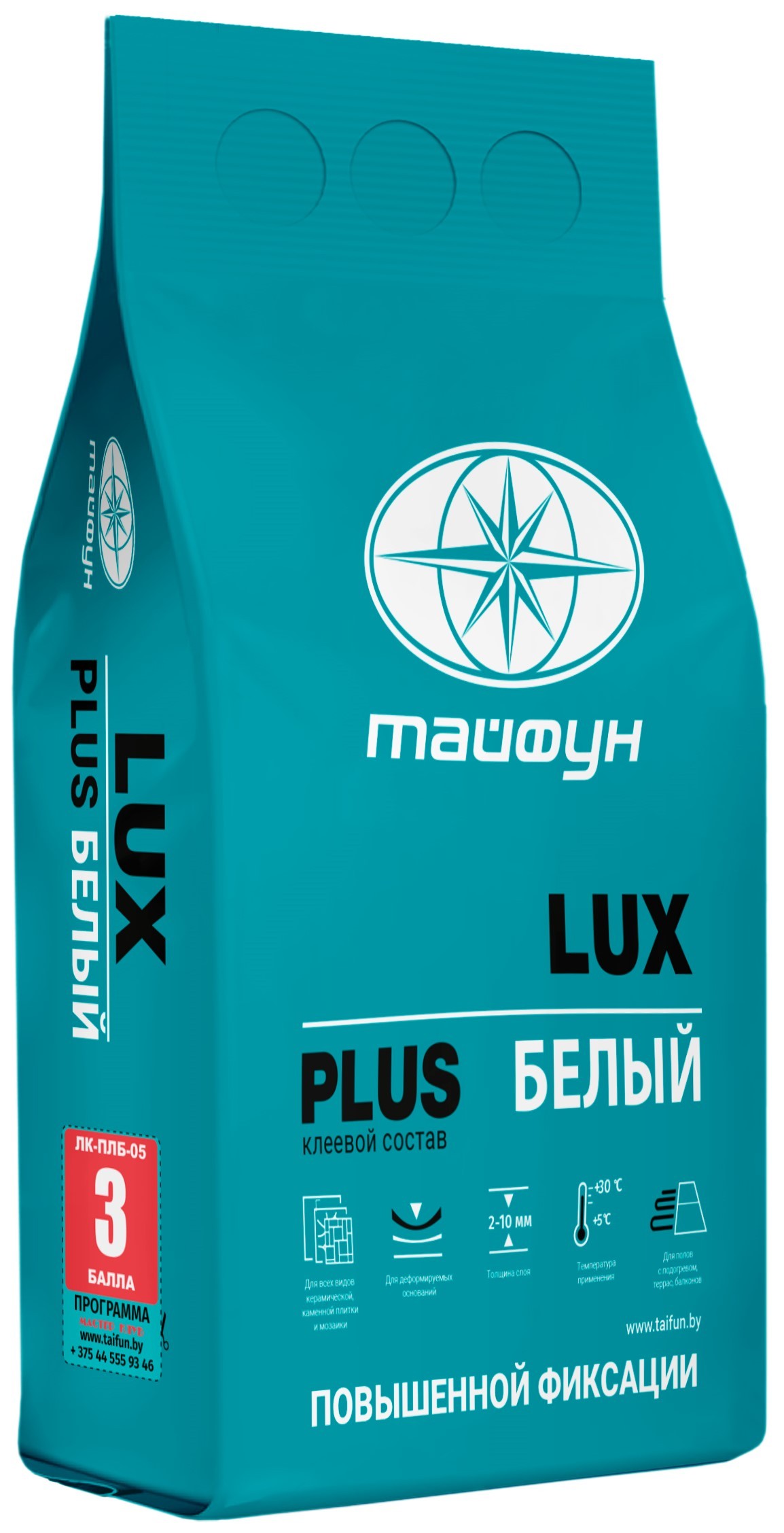 Клей для плитки ТАЙФУН Люкс плюс 5 кг белый – цементный клей с увеличенной адгезией, изготавливается на белом цементе. Предназначен для приклеивания изделий из стекла и светлого натурального камня, для облицовки оснований плиткой различного размера, мозаикой, натуральным и искусственным камнем. Подходит для облицовки различного типа минеральных оснований, работающих в том числе и при высоких эксплуатационных нагрузках. Отлично ведет себя при эксплуатации в условиях повышенной влажности или при постоянном контакте с водой. Может применяться для заполнения плиточных швов. Используется для наружных и внутренних работ.