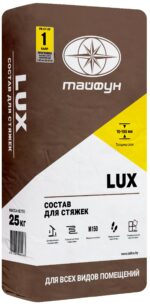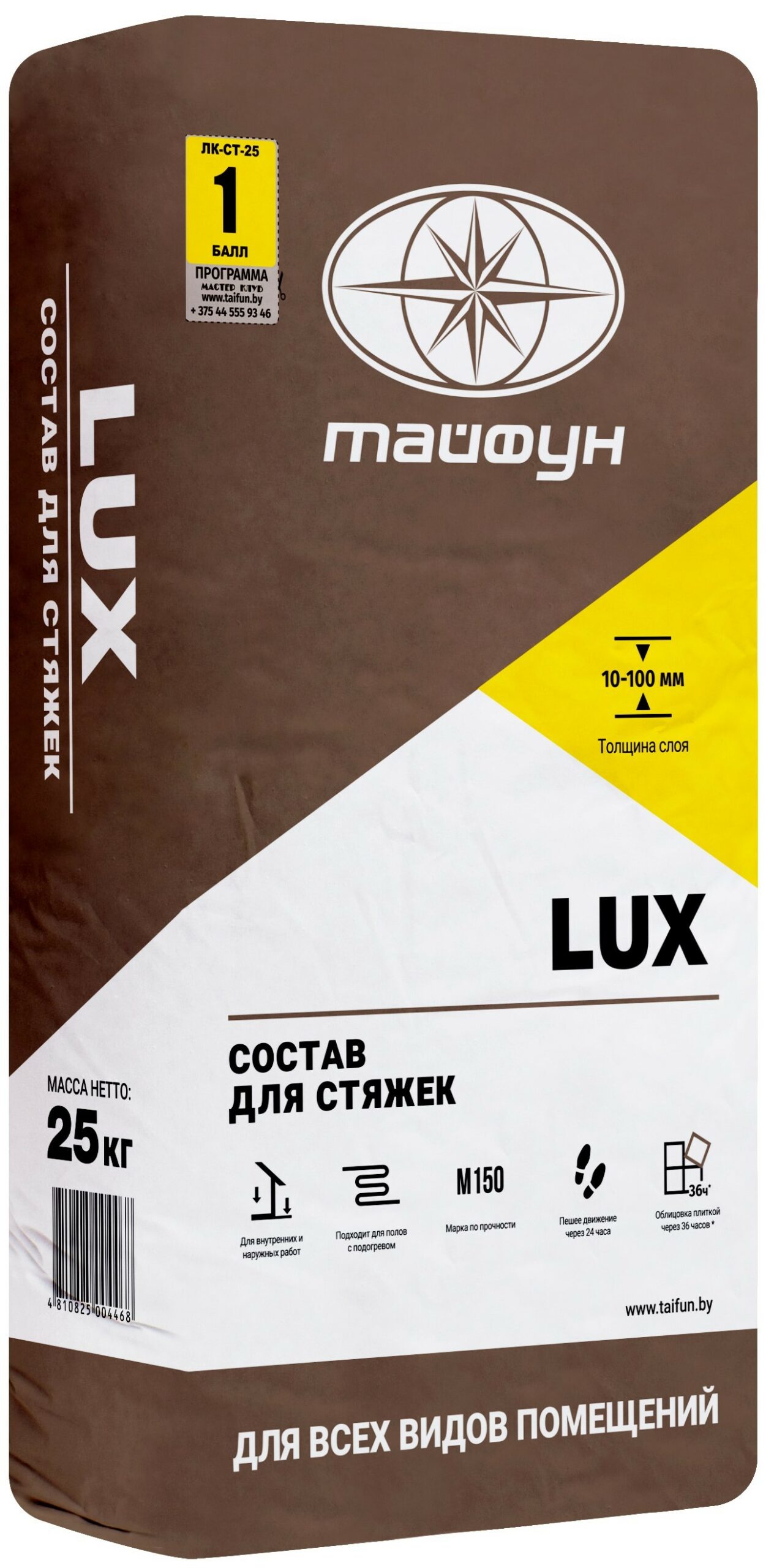 Стяжка цементная ТАЙФУН Люкс 25 кг предназначена для устройства цементной стяжки с целью выравнивания местных неровностей и придания необходимого уклона основанию. Рекомендуется использовать в жилых помещениях, зданиях общественного назначения с последующей отделкой керамической плиткой, плиткой из натурального камня, паркетом и др. либо как финишный слой.Виды основания: цементная стяжка (возраст более 28 дней, влажность ≤ 6 %); бетон (возраст более 3 месяцев, влажность ≤ 6 %).