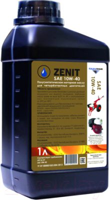 ZENIT Power Line SUPER SL/CF 10W-40 – полусинтетическое моторное масло, производится из высокоочищенных синтетических и минеральных базовых масел с применением современного европейского пакета присадок. Соответствует требованиям спецификации API SL/CF. Предназначено для всесезонного применения в силовой и садово-парковой технике. Не предназначено для применения в двигателях автомобилей! Рекомендовано для бензиновых четырехтактных двигателей воздушного охлаждения
