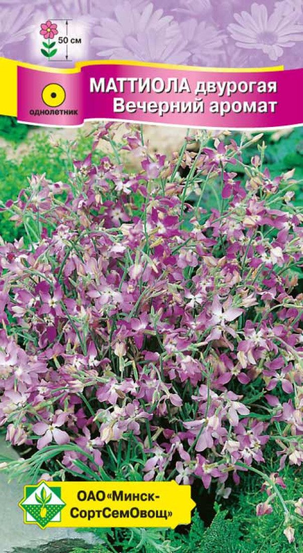 Семена маттиолаы двурогой Вечерний аромат МИНСКСОРТСЕМОВОЩ0 0,7 г – однолетнее растение высотой 40-50 см. Цветки мелкие, лиловые, в рыхлых соцветиях, закрыты днем. Но вечером и ночью… Что за дивный аромат! Применяется для создания неповторимого аромата в вечернее время на клумбах, балконах, у беседок. Посев семян производят в открытый грунт с конца апреля с интервалом в 20 дней. Пересадку не переносит. Хорошо цветет на солнечных и слегка затененных местах, на различных некислых почвах, но предпочитает суглинистые.