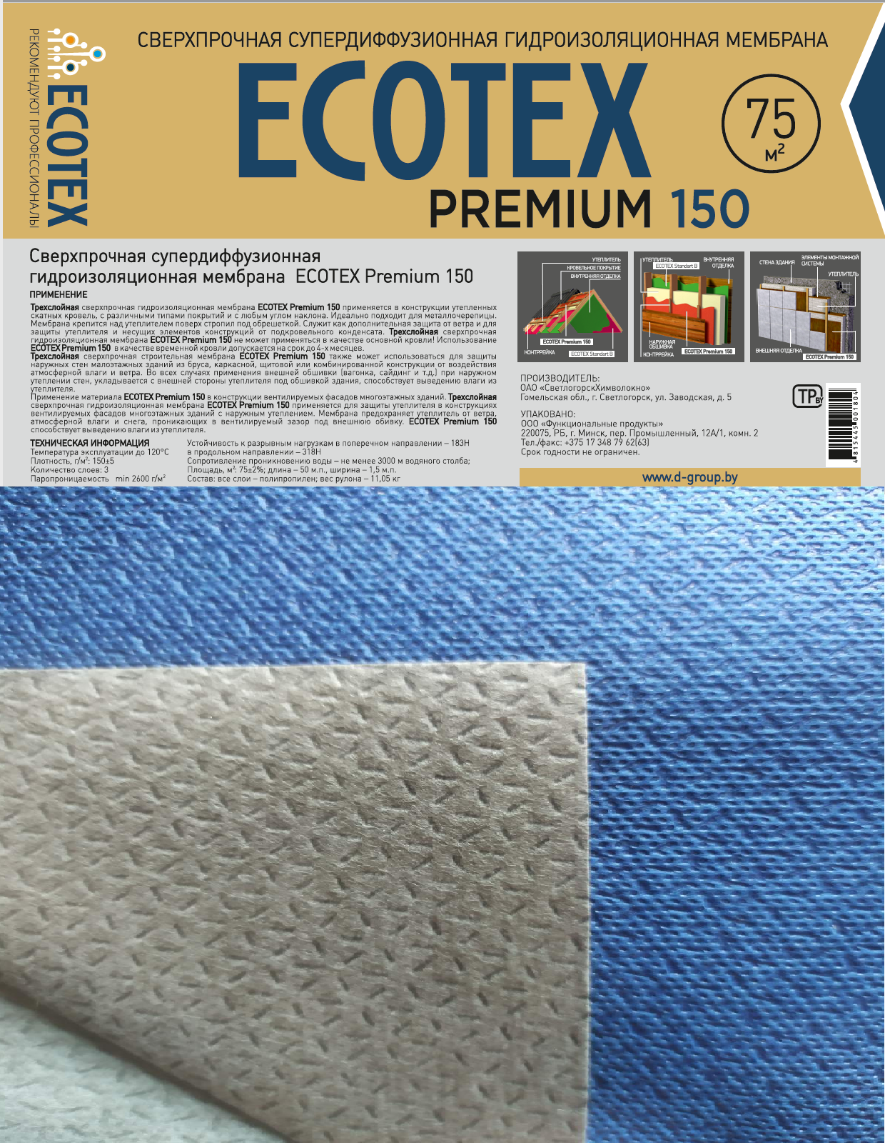 Сверхпрочная строительная мембрана ECOTEX Premium 150 также может использоваться для защиты наружных стен малоэтажных зданий из бруса, каркасной, щитовой или комбинированной конструкции от воздействия атмосферной влаги и ветра. Во всех случаях применения внешней обшивки (вагонка, сайдинг и т.д.) при наружном утеплении стен, укладывается с внешней стороны утеплителя под обшивкой здания, способствует выведению влаги из утеплителя.