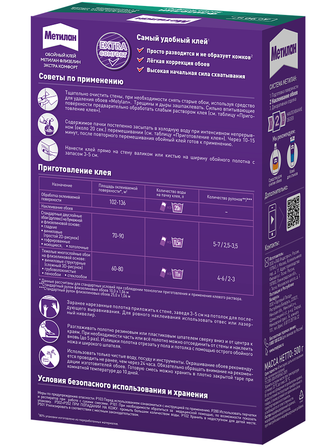 Высококачественный, быстрорастворимый клей на основе модифицированного крахмала для приклеивания всех типов флизелиновых обоев. Легко наносится прямо на стену, готов к применению через 10-15 мин, возможна коррекция во время приклеивания (до 5 раз в течение 15 мин), имеет отличную противогрибковую защиту, не образует комков, экологически безопасный. Преимущества: комфортное применение, Готовность в течение 10–15 минут, Не образует комков, Наносится на стену, Высокая начальная сила схватывания, Обои легко корректировать (можно отклеивать и наклеивать снова до 5 раз), Хранение готового раствора в закрытой таре до 10 дней. Состав: Модифицированный крахмал, Модифицированная целлюлоза, противогрибковая добавка. Хранение: Хранить в сухом прохладном помещении. Готовый обойный клей хранить в закрытой таре при комнатной температуре. Беречь от детей. Срок годности 48 месяцев. Инструкция по применению: Содержимое пачки постепенно засыпать в холодную воду (около 20 °C) при интенсивном непрерывном перемешивании. Также возможно добавление воды к сухому клею при интенсивном перемешивании. Через 10–15 минут после повторного перемешивания обойный клей готов к применению. Пока готовится клей, нарезать рулон обоев на полотна необходимой длины (высота стены + 3–5 см сверху и снизу). Нанести клей прямо на стену валиком или щёткой на ширину обойного полотна плюс 3–5 см. Приложить полотно обоев к стене, заведя 3–5 см на потолок для последующего выравнивания. Для ровного наклеивания использовать отвес или лазерный нивелир. Разглаживать полотно резиновым или пластиковым шпателем сверху вниз и от центра к краям для удаления пузырей воздуха и излишков клея. При необходимости часть или всё полотно можно отсоединить от стены и наклеить вновь (до 5 раз).