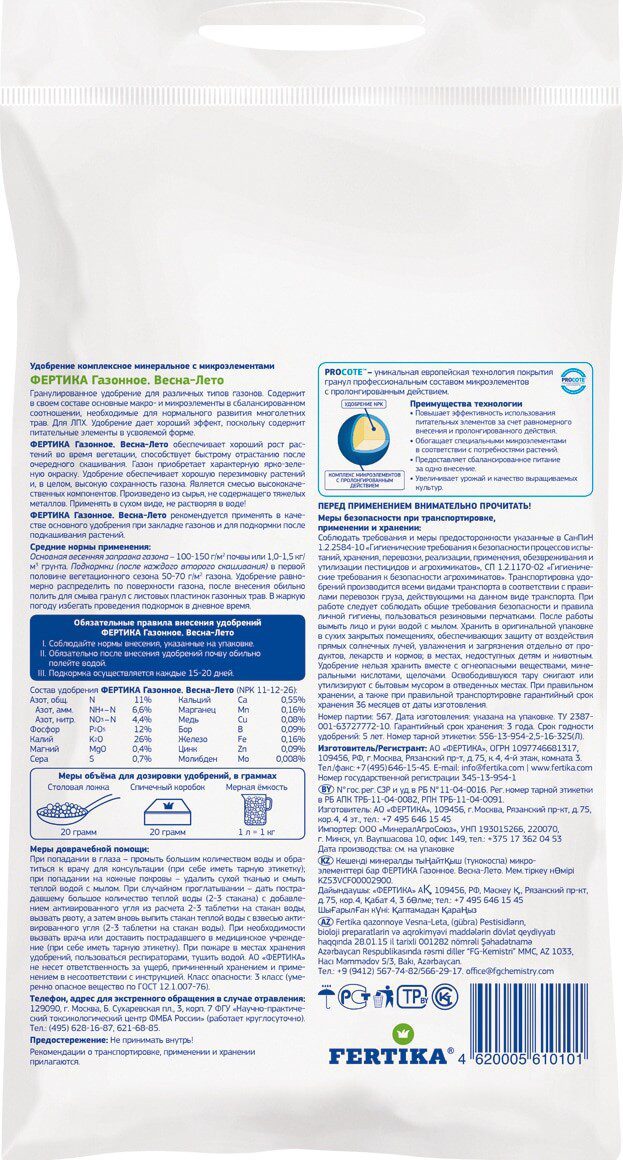 Удобрение минеральное FERTIKA Газонное весна-лето 5 кг содержит все необходимые макро- и микроэлементы в оптимальном соотношении. Способствует быстрому отрастанию трав после очередного скашивания. Повышает густоту травостоя, препятствуя распространению мха и сорных растений. Обеспечивает интенсивную ярко-зеленую окраску газона.