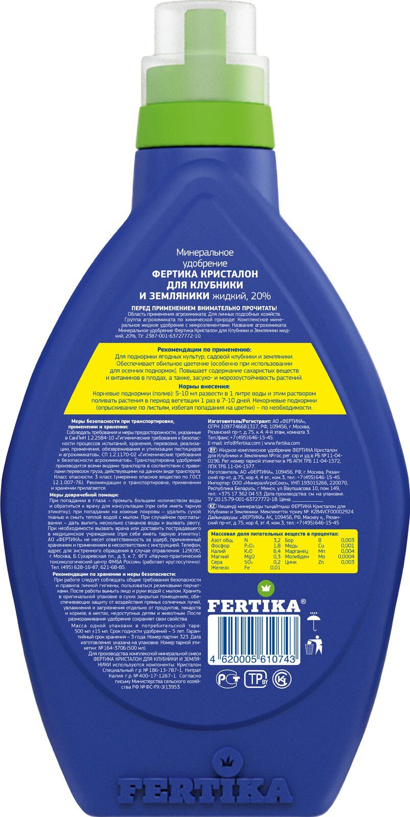 Удобрение минеральное FERTIKA Кристалон для клубники и земляники 500 мл для подкормки ягодных культур, садовой клубники и земляники. Обеспечивает обильное цветение (особенно при использовании для осенних подкормок). Повышает содержание сахаристых веществ и витаминов в плодах, а также засухо- и морозоустойчивость растений.