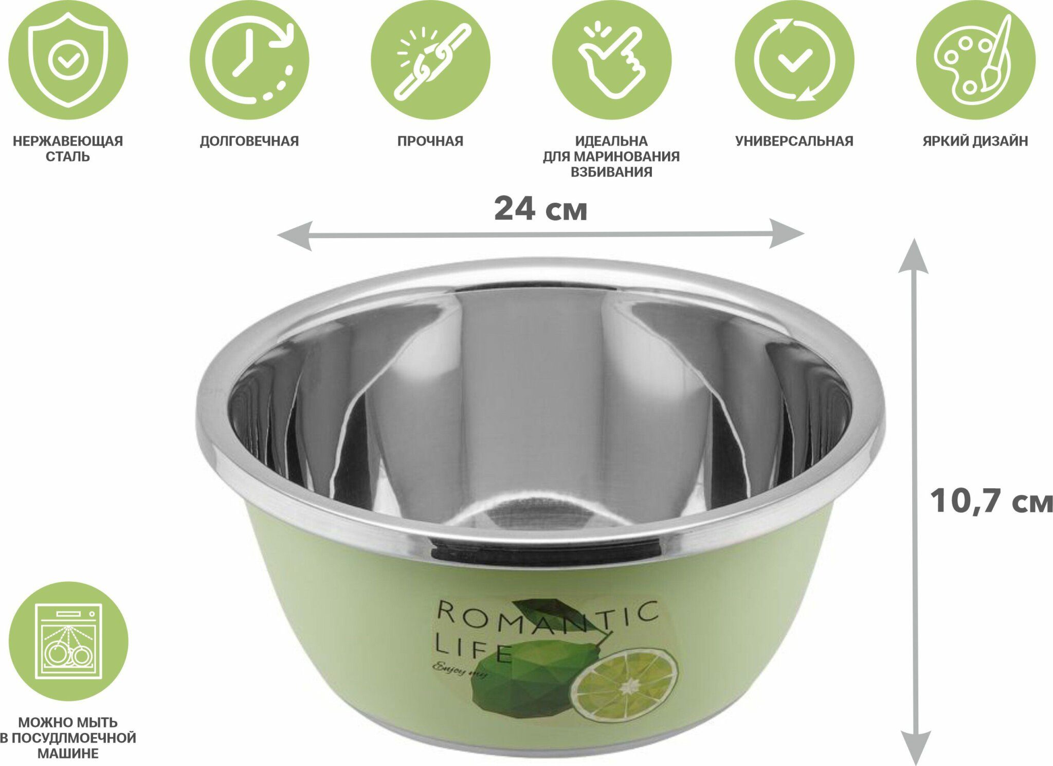 Миска из нержавеющей стали 24 см PERFECTO LINEA Romantic life Лайм (24-012421) является более привлекательной, чем миска из стекла и пластика. Миска из стали не лопнет и не расплавится в отличие от стеклянных и пластиковых. Миска выполнена из облегченной нержавеющей стали. Она может использоваться в качестве миски для взбивания, приготовления теста, перемешивания салатов и т.д. Миска подходит для маринования курицы, свинины, говядины, индейки и др., для отбивания фарша (так фарш насыщается кислородом), также можно промывать крупы. Отлично моется в посудомоечной машине.