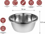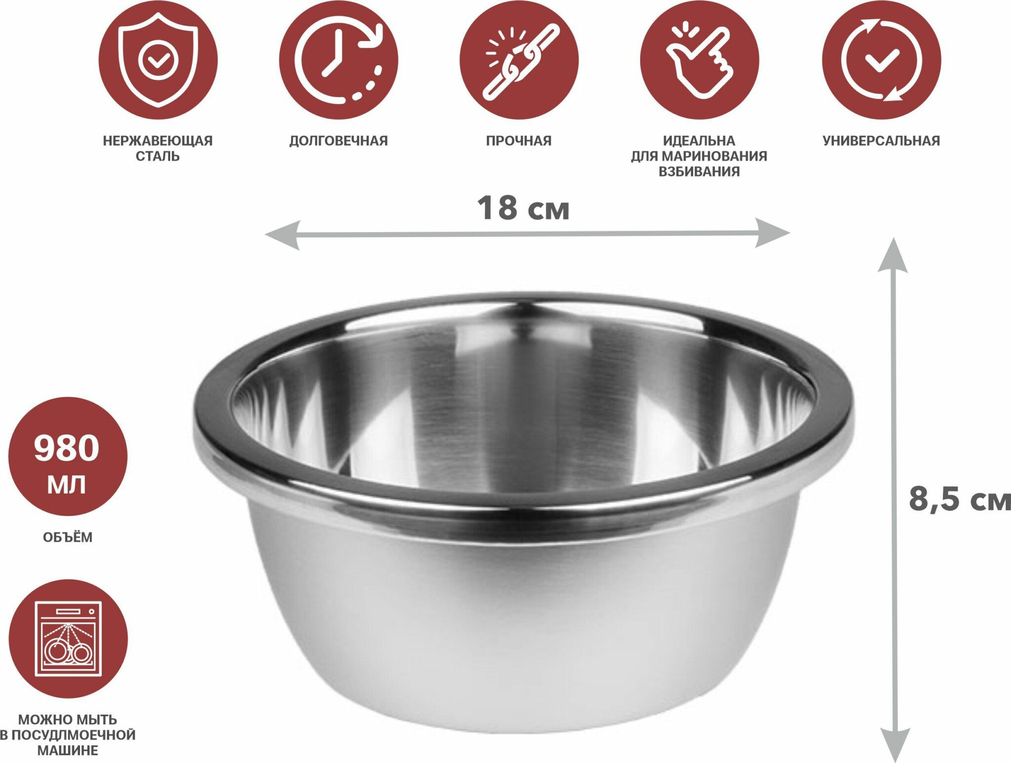 Миска из нержавеющей стали 18 см PERFECTO LINEA Chef (24-000180) может использоваться в качестве миски для взбивания, приготовления теста, хранения разнообразных овощей и фруктов и т.д. Миска из нержавеющей стали является более привлекательной, чем из стекла и пластика. Основными преимуществами являются: – не лопнет и не расплавится, в отличие от стеклянных и пластиковых – облегченная нержавеющая сталь – имеется широкий бортик – высота миски удобно защищает от брызг миксера – очень удобна для замешивания теста, вокруг всё чисто – не нужно бояться, что стенки поцарапаются или разобьются, как у стекла – удобна в использовании холодных и горячих продуктов, для опары (дрожжевое тесто поднимается всегда), удобно перемешивать салаты с горкой – подходит для маринования курицы, свинины, говядины, индейки и др., для отбивания фарша (так фарш насыщается кислородом) – можно промывать крупы – дуршлаг или сито удобно ложится на бортики, поэтому удобно перетирать творог для замешивания сырников – универсальная, легко найдет применение в доме, особенно если в семье есть маленькие дети или пожилые люди – отлично моется в посудомоечной машине.