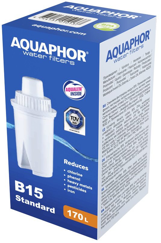 Картридж фильтрующий АКВАФОР В15 (В100-15) Стандарт используется в кувшинах со стандартным круглым гнездом посадки для картриджа диаметром 5 см. Подходит к некоторым кувшинам производства Германии и США. С картриджем В15 (В100-15) в вашем фильтре кувшине у вас всегда в доступе чистая безопасная вода, которая не испортит ваш чай, кофе или суп. Вода, очищенная модулем В15 (В100-15), подходит для приготовления питания детям от 2-х лет − по рекомендации «Института токсикологии» Федерального медико-биологического агентства. 170 литров чистой воды для всей семьи.