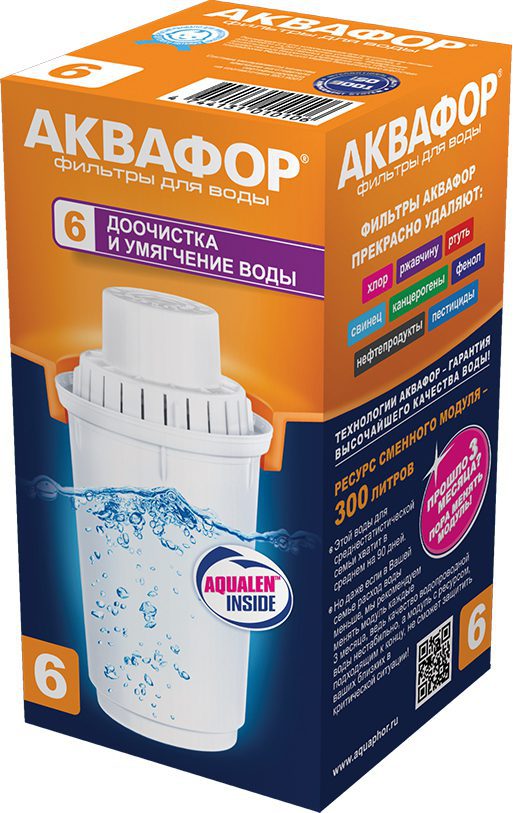 Картридж фильтрующий АКВАФОР В6 (В100-6) очищает водопроводную воду от вредных примесей и уменьшает образование накипи в чайнике, мультиварке и кофе-машине. В жесткой воде чай и кофе долго завариваются и получаются не ароматными, а бульоны и другие блюда − пресными, потому что из-за избытка минералов вода плохо “вбирает” вкус ингредиентов. Используется в кувшинах Аквафор c круглым гнездом посадки для картриджа диаметром 7 см.В6 (В100-6) рекомендуется для очистки воды низкой и средней жесткости (до 4 мэкв/л). Если без использования фильтра накипь появляется в чайнике через несколько дней – у вас вода высокой жесткости. Менять модули в фильтре-кувшине придётся слишком часто (раз в 2 недели). Выгоднее использовать фильтры обратного осмоса, которые помогут полностью устранить накипь (модули меняются раз в полгода и раз в год. Ресурс модуля В6 (В100-6) − 300 литров: в семье из 3-х человек этого хватит на 2 месяца использования. В среднем взрослому человеку в сутки нужно 3 литра воды, включая напитки, супы и бульоны. Когда ресурс картриджа по удалению жесткости закончился – в чайнике может снова появиться накипь. Это не значит, что картридж теперь не работает: он продолжает удалять из воды вредные примеси, хотя и не умягчает воду.