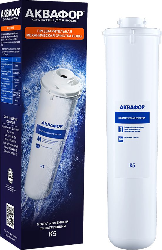 Картридж фильтрующий АКВАФОР К5 (К1-05) – неразборный корпус сменного модуля для механической предочистки воды. Используется в системах АКВАФОР с отдельным краном. Может быть укомплектован картриджами различной плотности.